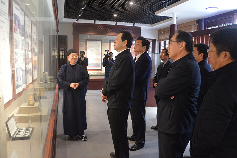 杨岳部长一行在茅山乾元观住持尹信慧道长的陪同下实地考察历史文化陈列馆、图书馆、档案馆等场所,详细了解道观的历史沿革、场所建设、人才培养、慈善公益、文化交流等情况,并重点询问了江苏道教学院的筹建进展与金顶工程的规划设计方向。