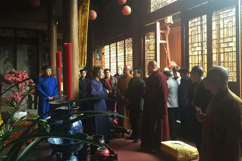 2016年2月28日,山东省济宁市嘉祥县民宗局副局长郭长俊、县佛协会长妙谛法师、纸坊镇文化旅游办等一行16人到花神宫参访交流。