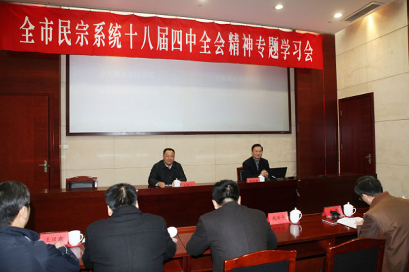 为了深入学习贯彻党的十八届四中全会精神,增强民宗干部、少数民族群众及信教群众法治思维和尊法、学法、守法、用法的自觉性。2014年12月22日,市民宗局举办了十八届四中全会精神专题讲座,辖市区民宗局领导、市各民族宗教团体班子成员及局机关全体人员共70余人参加了学习。