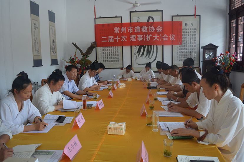 2016年8月18日上午,市道教协会在茅山乾元观召开二届十次理事(扩大)会议。市民宗局副局长颜良进等领导应邀出席会议。市道协全体理事、各场所负责人近25人参加。会议由市道协会长孔新芳道长主持。