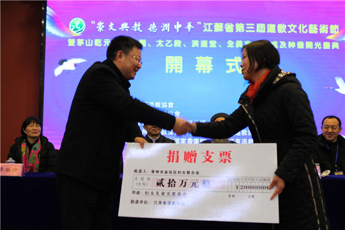 开幕式上,同时举行了慈善捐款仪式,将文化艺术节所募20万元善款捐赠给金坛区妇女儿童联合会,用于救助贫困病残的妇女儿童。