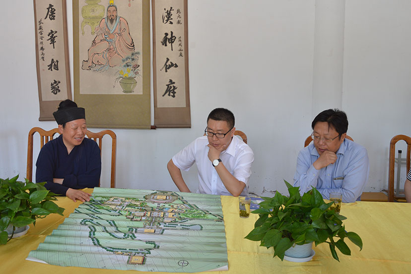 乾元观住持尹信慧道长热情接待了沈区长一行,并对区政府一直以来的关心与支持表示感谢,其中特别就给予道学院的部分资金与土地使用的帮助表示由衷的感谢。随后,尹道长向沈区长就即将修建的“金顶”工程与“江苏道教艺术学院”的相关筹建情况作了重点汇报。