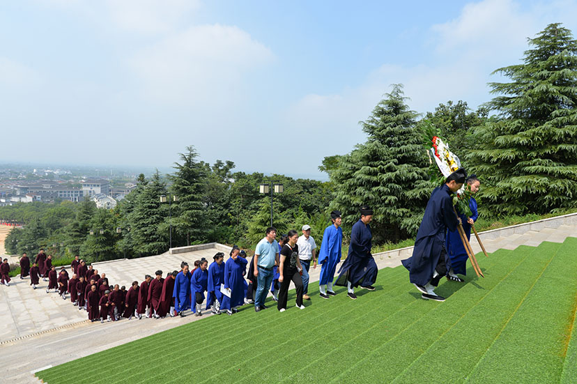 11时,至茅山新四军纪念馆处,举行向苏南抗战胜利纪念碑敬献鲜花仪式。道俗两众在纪念碑前肃穆而立,唱国歌,宣读祭文,默哀,敬献鲜花,瞻仰烈士纪念碑,深切缅怀为中国人民解放事业和共和国建设事业英勇献身的英雄先烈!