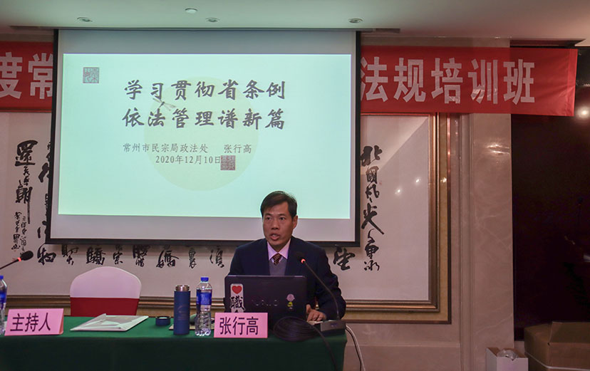 12月10日,常州市道教协会举办2020年度政策法规培训,全市道教活动场所负责人、骨干教职及市道协驻会工作人员近40人参加培训,市民宗局政法处处长张行高、市委党校教授邵晔分别就新修订《江苏省宗教事务条例》和《民法典》进行专题授课。