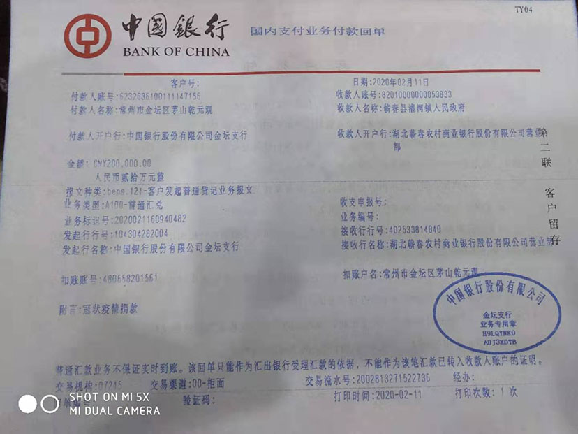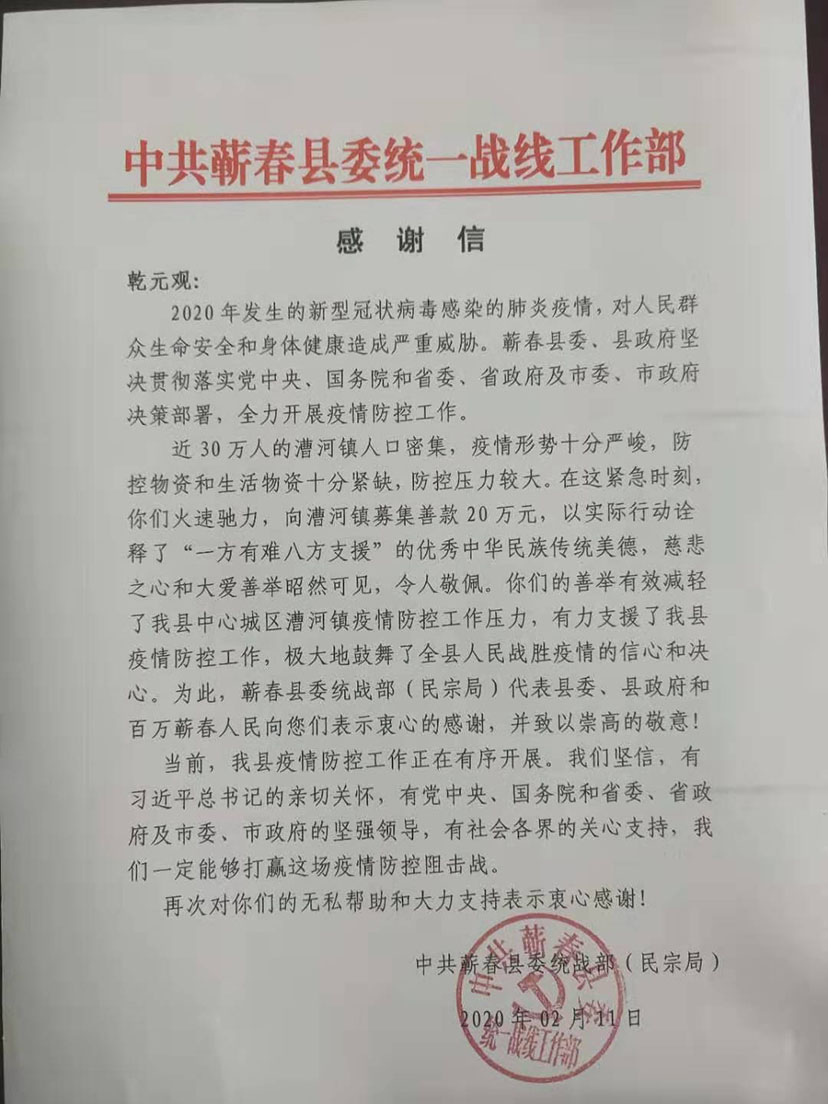 在湖北武汉新冠病毒疫情爆发后,茅山乾元观心系疫区同胞安危,在1月29日至2月10日间起发起慈善募捐活动,得到了合观道众、十方善士大德的慷慨捐赠,总计筹得善款20万元。黄冈市的疫情仅次于武汉市,战疫压力大,考虑到医用物资较为紧张且主要由政府统一调拨,茅山乾元观决定将这份爱心善款直接捐赠给黄冈市蕲春县漕河镇人民政府,用于购置疫情防控物资和生活用品,助力疫区同胞共度难关。