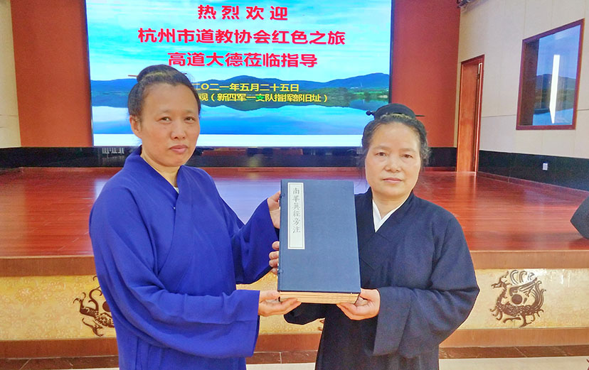 杭州市道教协会副会长、抱朴道院住持王崇坤道长代表参访团向茅山乾元观赠送《南华真经旁注》,金坛道教协会副会长、茅山乾元观都管王信慈道长代表道观回赠吉祥小礼品,永固道谊!