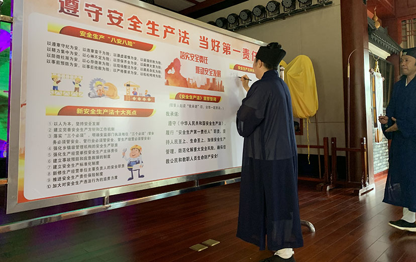 本次培训活动首先组织全体参与人员观看电视专题片《生命重于泰山》,其次由区道协会长倪雪斌道长带头作了《安全生产法》学习宣讲,将新修订的《安全生产法》中的十大亮点一一向大家作了解读。宣讲结束后,全体参训人员在省、市道协会长、茅山乾元观住持尹信慧道长的带领下进行安全生产主体责任践诺签名活动,全体参训人员有序上台,在签名墙上签下自己的名字。随后,尹信慧道长就“崇俭戒奢”教育活动的背景和相关内容作了全面解读,并宣读了全国性宗教团体《关于崇俭戒奢的共同倡议》,进一步推进部署了全区道教领域“崇俭戒奢”教育活动。