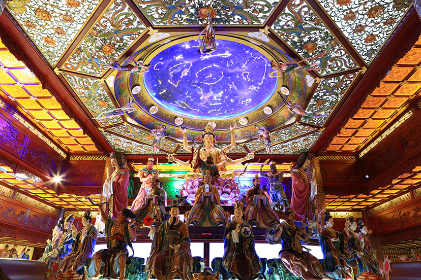 1993年4月,金坛县人民政府正式发文,批准恢复开放乾元观。老子有云:“天道无亲,常与善人。”一念之诚,十方皆应;一念之善,天人共鉴。20多年来,尹信慧住持和道众们发大愿心,励志苦行。从砍柴担水、开荒种地,到完善管理、服务社会,不辞艰辛,弘法度人,引来十方感应。当地政府在水电、通讯、用地、道路建设等方面都给予了极大的帮助和支持,广大信徒与社会各界人士纷纷慷慨解囊。乾元观一步一个脚印,在上无片瓦、下无立锥的茅草地上建成殿堂房屋四百余间,建筑面积一万多平方米。依山势,虚皇坛、上山台阶、龙文化御道构成一道中轴线,紫光坛、灵官殿、大罗宝殿、玉皇殿等主殿堂贯穿其上。轴线两侧又分布了东西拜殿、客堂、陈列馆、太元宝殿、慈航殿、钟鼓楼等。斋堂、太乙殿、全真宗祠、松风阁、演道堂、道众丹房等,则按道教建筑规制,有序地设置在偏殿之后。这一座座巍峨庄严、古朴典雅,充满道教色彩和江南韵味的仿明清苏式古建错落有致地屹立在青龙山上,远远望来,郁郁林间,若隐若现,恬静幽美,气势非凡,直追玄洲仙境。