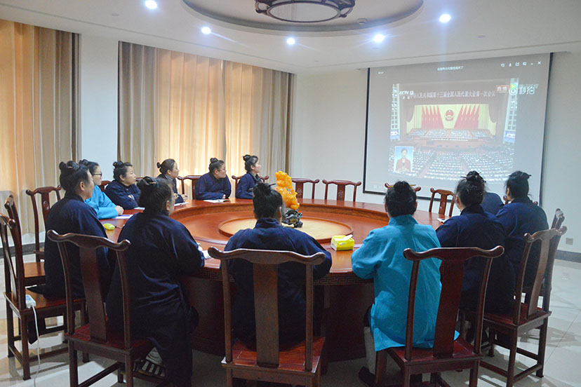 2019年3月24日下午,茅山乾元观住持尹信慧道长带领道众学习全国两会精神,收听收看习近平主席、李克强总理在全国两会上的重要讲话,重温四个意识、四个自信、四进宗教场所等政策知识的重要内涵和意义。
