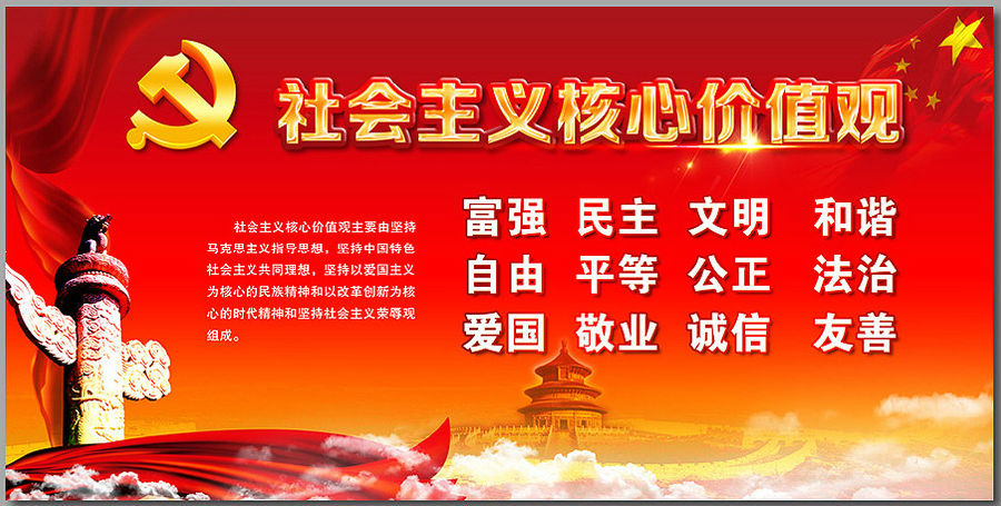社会主义核心价值观:富强、民主、文明、和谐自由、平等、公正、法治爱国、敬业、诚信、友善意义:一...