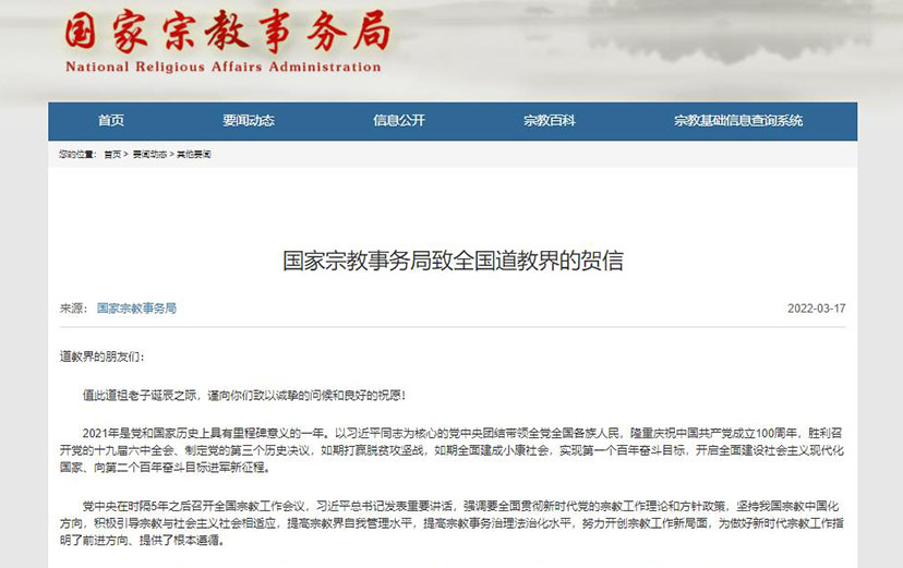 农历二月十五(3月17日)太上老君圣诞良辰,国家宗教事务局向全国道教界发来贺信。贺信指出,过去的一年,全...