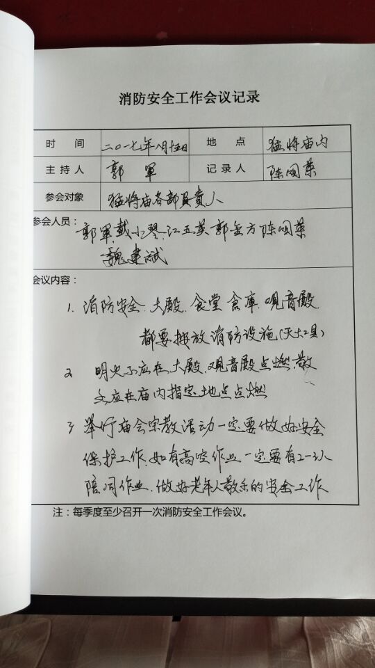 为继续巩固消防安全红线意识、落实消防安全责任、维护场所消防安全稳定局面、营造和谐稳定的社会环境。2017年8月16日,新北区猛将庙管理小组开展了消防安全工作培训,对消防器材的使用加强了培训及演练,并召开了本季度消防安全工作会议,就近期市民宗局下发的《安全工作基础台账》开展了深入学习,汇报总结了前期场所消防安全自查自纠情况,针对下一阶段整改落实研究部署了有关工作。