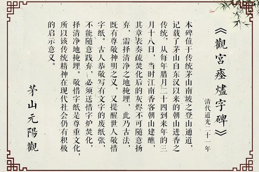 “观宫瘗烬字碑”位于传统茅山南坡之登山通道,记载了茅山自东汉以来的朝山进香之传统,从每年腊月二十四到来年的三月十八日,当时江南香客朝山建醮,其章表奏疏焚化后的灰烬不可随意扬弃,需择清净之地掩埋,此乃古法,既有尊敬神明之义,又提醒世人敬惜字纸。古人恭敬写有文字的废纸张,不能随意践弃,必须送惜字炉焚化,择清净地掩埋。敬惜字纸是尊重文化,所以该传统精神在现代社会仍有积极的启示意义。