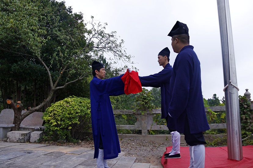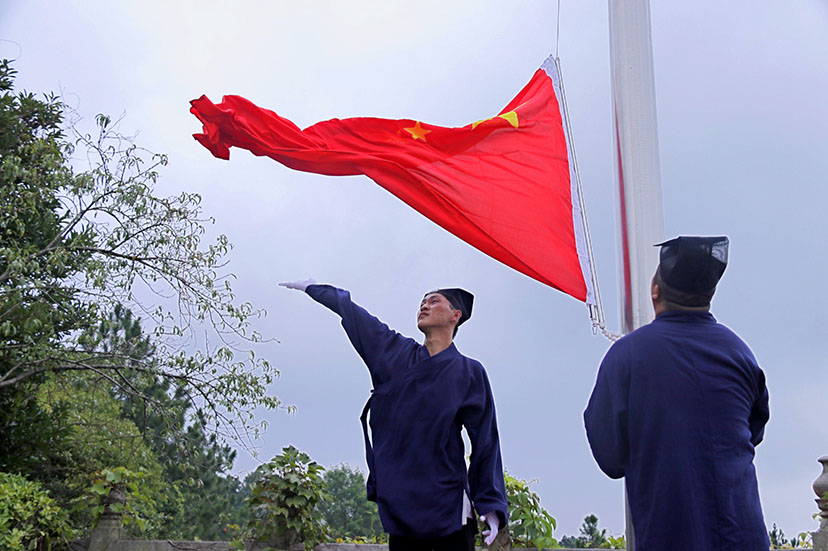 2018年8月26日,茅山元阳观庄重地举行了升国旗仪式。当家倪道长恭敬地手捧崭新的五星红旗,步履稳重、神情专注,将其交到两位护旗的道长手上,合观道众道装整齐、安静肃立。五星红旗随着国歌声缓缓升起,全体道众集体行注目礼。金坛区民族宗教局局长柏虎斌参加了仪式,并宣讲了“四进”宗教活动场所的内容及其重要意义。