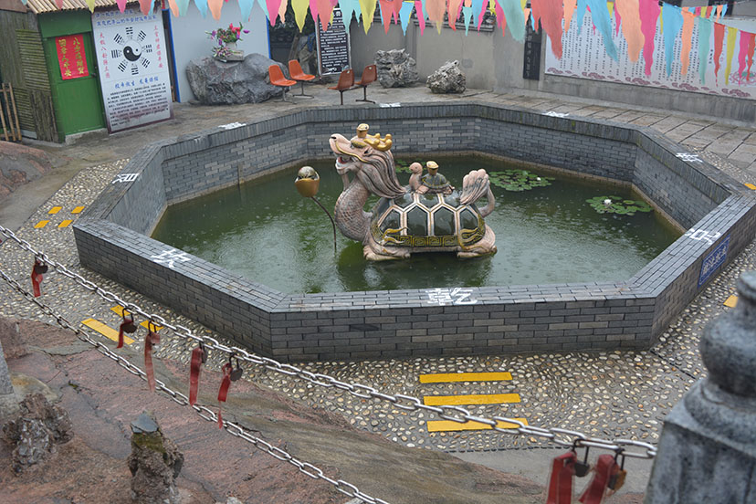 出山门殿,受山势所限,是一个狭长的庭院,院东有一浅水池,叫:玉津池。池中有龙龟赑屃戏水,香客游人喜欢在这里摄影留念。