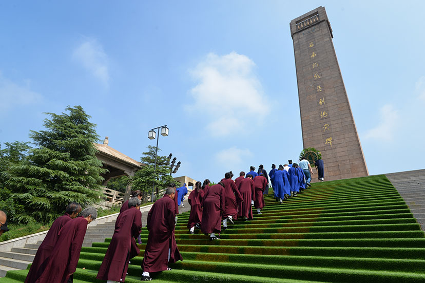 11时,至茅山新四军纪念馆处,举行向苏南抗战胜利纪念碑敬献鲜花仪式。道俗两众在纪念碑前肃穆而立,唱国歌,宣读祭文,默哀,敬献鲜花,瞻仰烈士纪念碑,深切缅怀为中国人民解放事业和共和国建设事业英勇献身的英雄先烈!