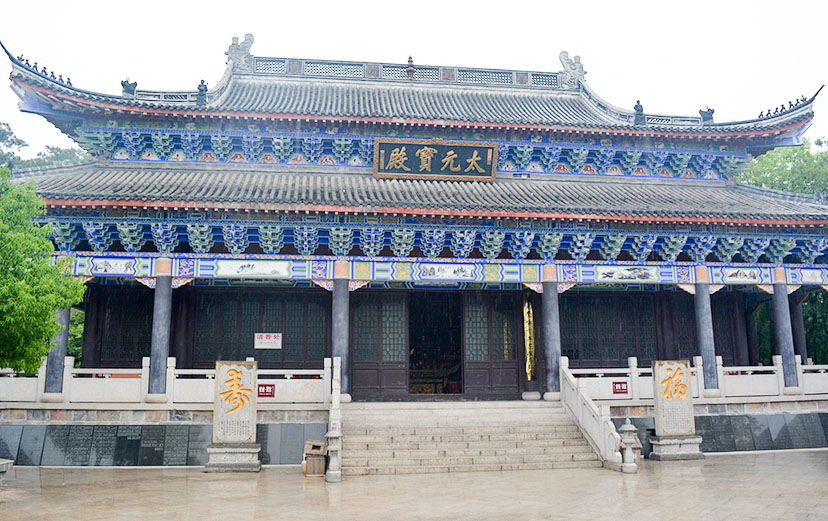 太元宝殿。殿阔30米,高达 24.8米,彩绘斗拱,殿内供奉三茅真君:茅盈、茅固、茅衷和四大元帅:岳飞、赵公明、马勝、温瓊及神仙岛36箓神仙。有“茅山第一灵签”之说。