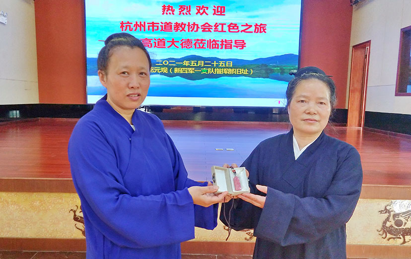 杭州市道教协会副会长、抱朴道院住持王崇坤道长代表参访团向茅山乾元观赠送《南华真经旁注》,金坛道教协会副会长、茅山乾元观都管王信慈道长代表道观回赠吉祥小礼品,永固道谊!