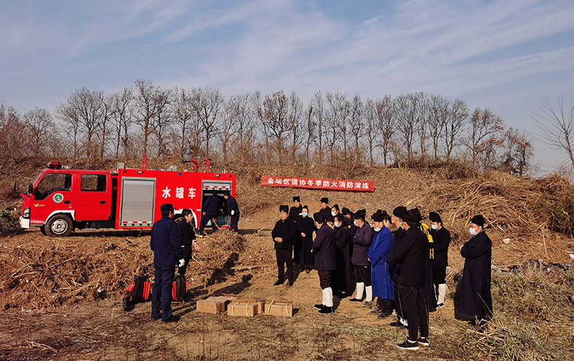 上午8:30,区道协首先组织全体参会人员参加金坛区道协冬季防火消防演练,邀请茅东林场森林消防队为大家讲解介绍风力灭火机、灭火弹等森林消防灭火器材的使用方法。随后,大家结合讲解内容进行灭火实战演练。