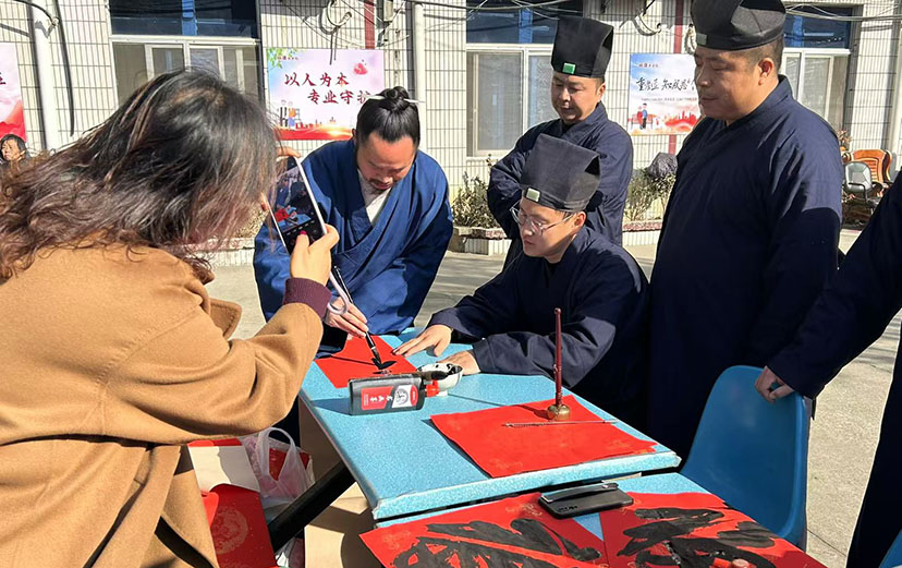 演出期间,道长们与老人们促膝长谈,了解饮食起居,为养老院书写对联。随后,茅山元阳观经乐团与紫心斋武术队队员和冯俊翔老师先后为老人们表演了传统武术、道教音乐演奏、《萱草花》、《突然间的自我》、《扬鞭策马运粮忙》等精彩节目,他们用欢快的节奏、优美的舞姿,赢得了现场老人们的阵阵掌声,丰富了老人们的日常生活。