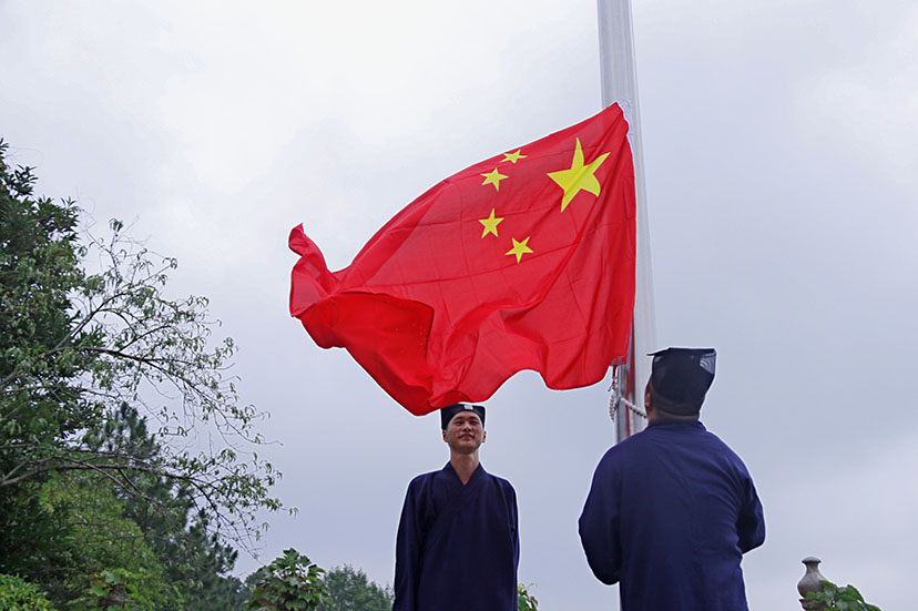 2018年8月26日,茅山元阳观庄重地举行了升国旗仪式。当家倪道长恭敬地手捧崭新的五星红旗,步履稳重、神情专...